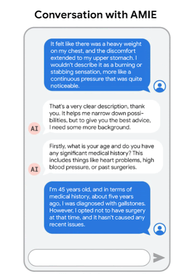 - AMIE: A Research AI System for Diagnostic Medical Reasoning and Conversations, https://research.google/blog/amie-a-research-ai-system-for-diagnostic-medical-reasoning-and-conversations/ (last visited Jun. 3, 2025). ↩︎