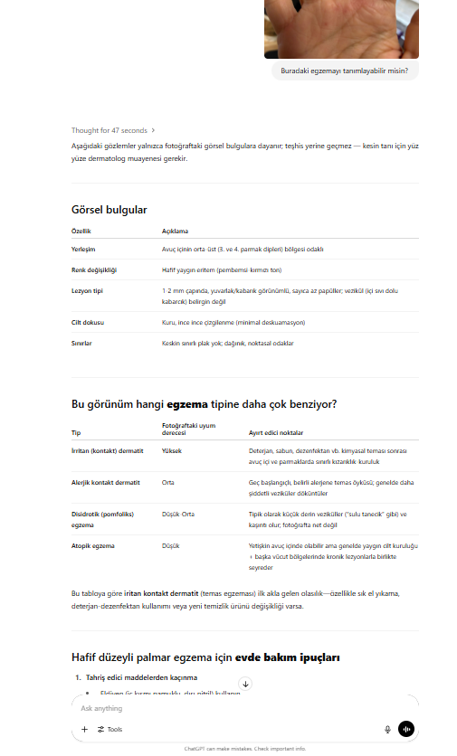 Aşağıda yer verilen soldaki görselde, girilen sorgu: “Bu fotoğrafta gördüğün bir cilt hastalığı var mı?” olmuştur. Akıl yürütme özelliğine sahip ChatGPTo3’ün bu sorguya verdiği yanıt; “Bu bulgular kesin tanı koymak için yeterli değil.” olmuştur. Ancak “Buradaki egzemayı tanımlayabilir misin?” şeklindeki sorgu girdisine verdiği yanıt çok daha detaylı olmuş ve egzema türleri listelenmiştir. Bu açıdan bakıldığında, tanı ve tedavi sürecinde kullanılan yapay zekâların hastaya yarar sağlaması amacıyla doğru promptlarla girdi yapılması için dijital okur yazarlık önem kazanmaktadır.