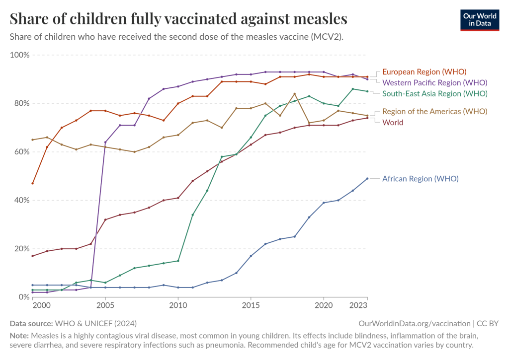 Günümüzde, bebeklerin %80’inden fazlası DTP3 aşısının tüm dozlarını almaktadır. Aşağıdaki grafikte de görüldüğü gibi, küresel kızamık aşılama oranı 2000 yılında %20’nin altındayken, günümüzde %70’in üzerine çıkmıştır.
