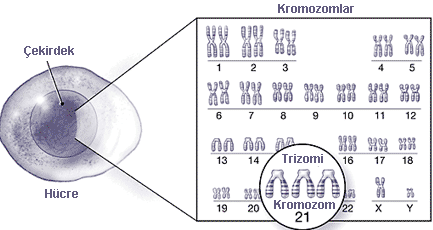 - Translokasyon (%3-4): Fazla 21. kromozom başka bir kromozoma (genellikle 14. kromozom) yapışır. Kalıtsal olabilir.