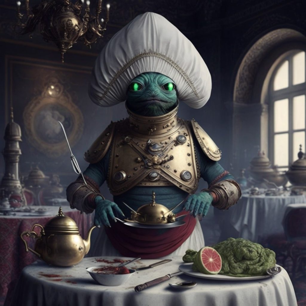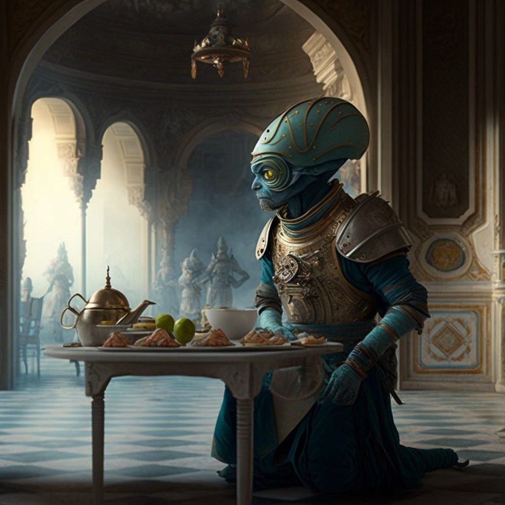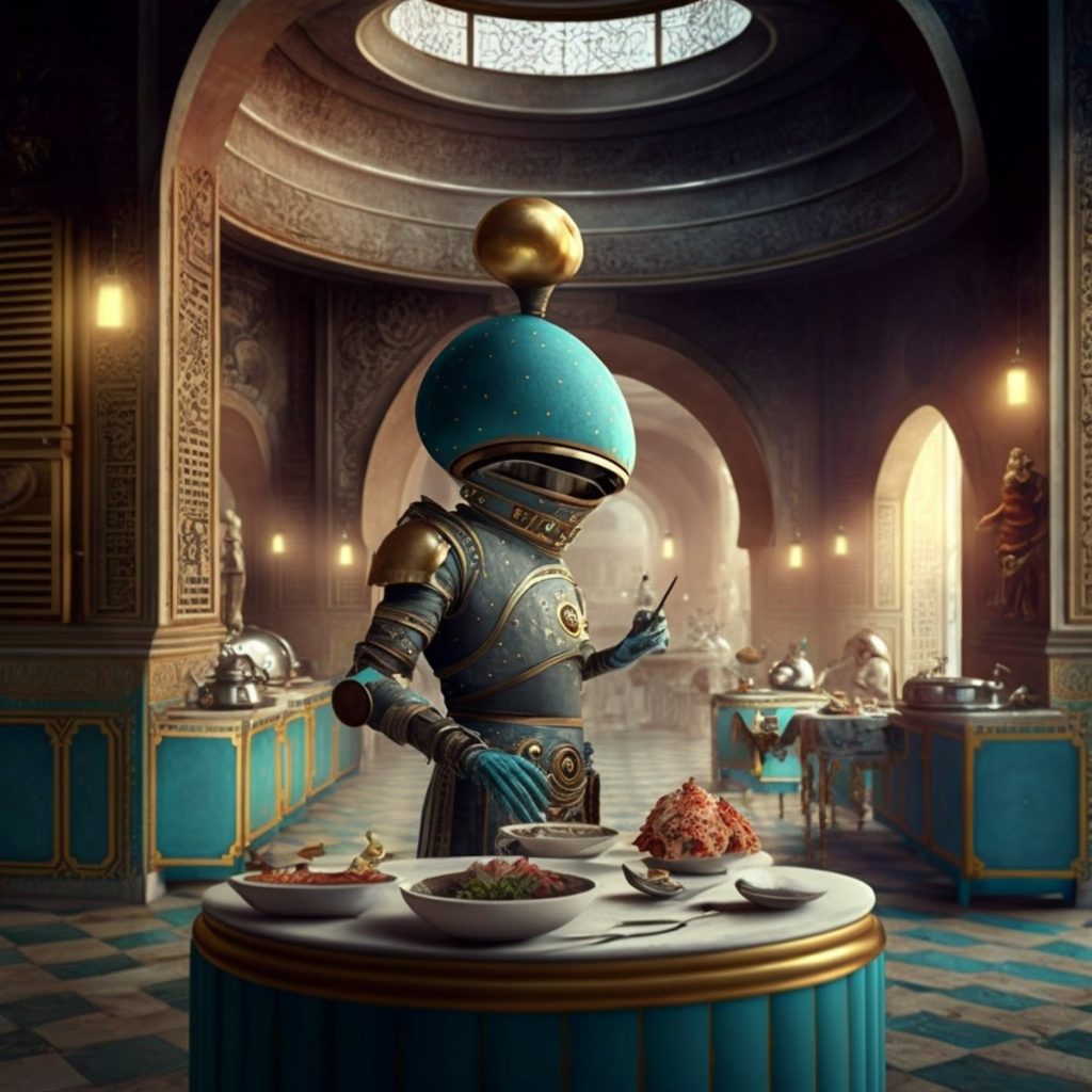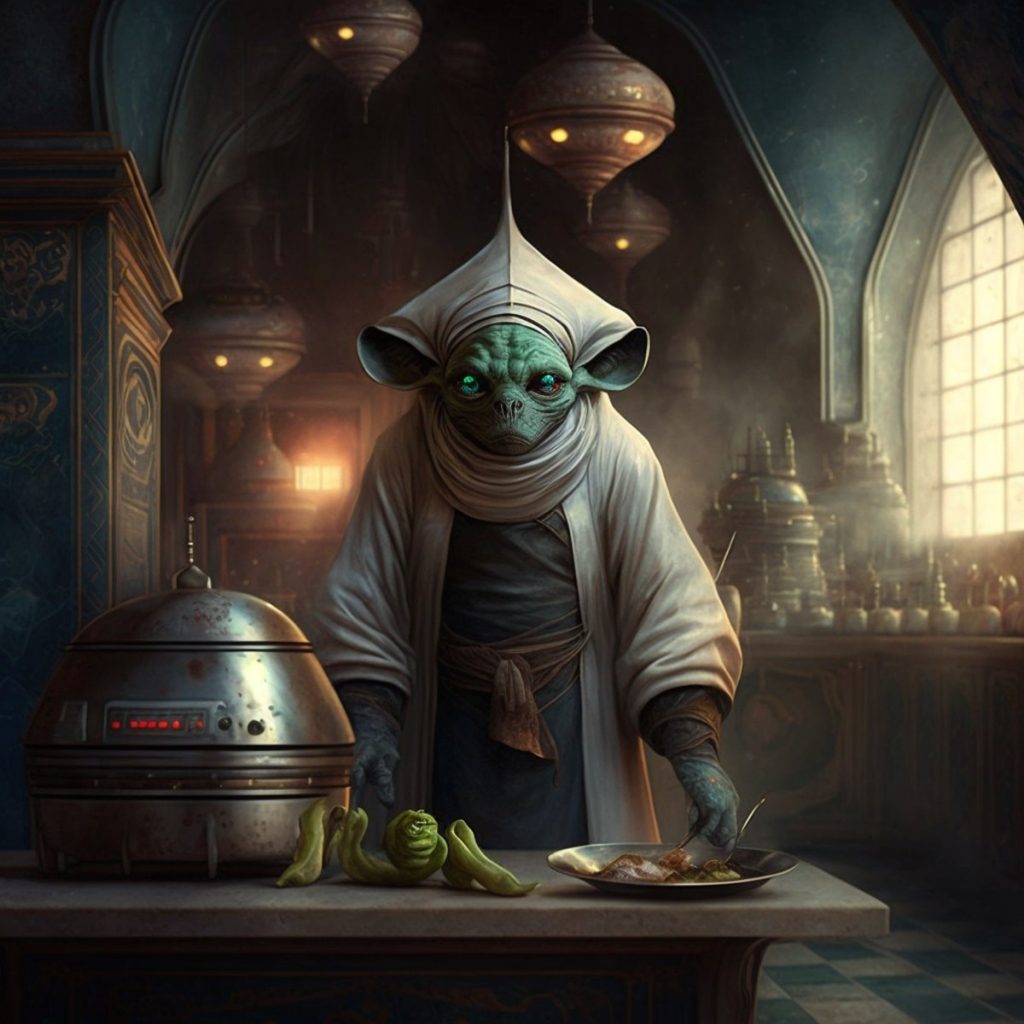 Bir başka YZ uygulaması olan “midjourney”e Futuristik Osmanlı Sarayı Aşçılarını yaptırmıştım. Bunlar uzaydaki çeşitli gezegenlerden devşirilen aşçılardı. Kanuni, Şehzade Mustafa’yı öldürtmüyor ve Osmanlı’nın yükseliş devri devam ediyor, Sanayi Devrimi öne alınıyor, uzaya yüz yıl kadar önce çıkılıyor vs. Uzak gezegenler kolonileştirildiğinde, buralardan devşirmeler getiriliyor ve yetenekli olanlar sarayda aşçı olarak alınıyordu. YZ bunu görselleştirdi ve işte ortaya çıkanlar:
