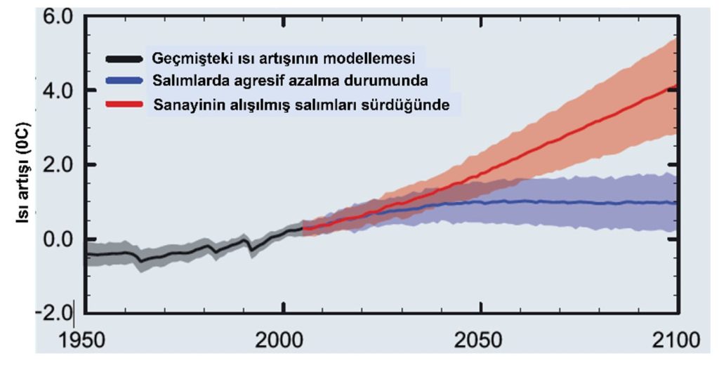 2100’e kadar küresel ısı artışının modellemesi ( The Royal Society UK ve US National Academy of Sciences, 2020, sf. B8)