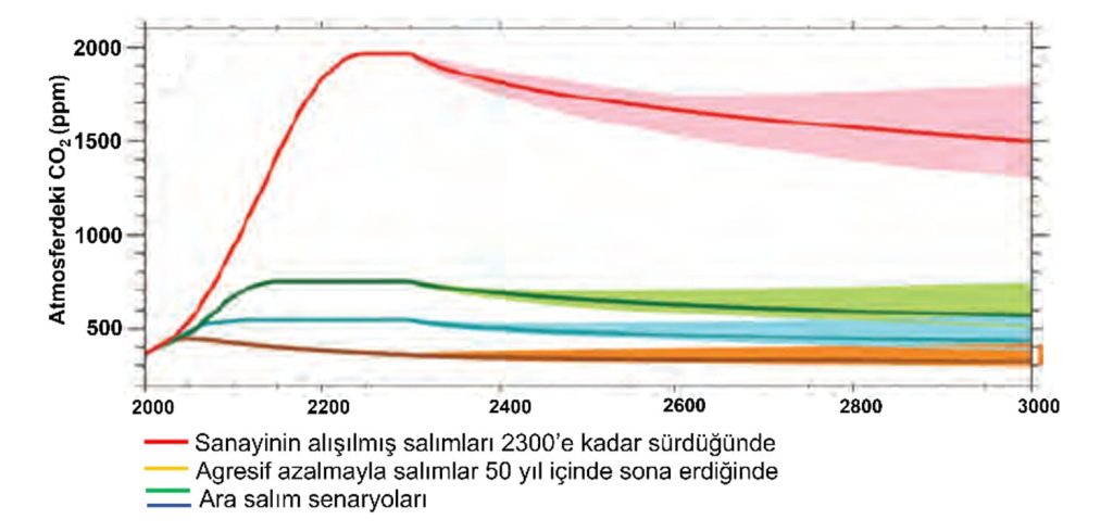 Gelecekteki küresel çevresel değişim, insan gelişimin farklı sosyoekonomik gidişleri ve politika seçimleri doğrultusunda öngörülen uzun erimli senaryolar ile canlandırılabilir (Lyon ve diğ., 2026, sf. 7). Bu senaryoların en bilinenleri olan Paylaşılmış Sosyoekonomik Patikalar, sera gazı salımlarının gidişlerine bağlanarak küresel gelişim ile küresel sıcaklık düzeyleri arasındaki bağlantıyı gösterirler. Doğal sermayenin böyle hoyratça harcanmasının iki birlikte giden sonucu vardır (Wilson, 2002, sf. 150). Birincisi, zengin daha çok zengin olurken yoksulun daha da fakirleşeceği anlamında ekonomiktir. İkincisiyse, doğal ekosistemlerin ve türlerin hızlanarak yok olacağıdır. Bütün jeoloji tarihindeki kitlesel yok oluşlarda görüldüğü gibi3, denizlerdeki ısının olağandan daha sıcak duruma gelmesiyle zehirlenen mercan resiflerinde toplu yok olmalar gözlemlenmiştir (Walther ve diğ., 2002, sf. 392). Antroposen’de, yani 1952’den günümüze omurgalı soylarının tükenmesi, Pleyistosen’den Holosen’e geçişteki iri canlıların yok olmasından daha fazla ve hızlıdır (Barnosky ve Hadly, 2026, sf. 2). Geçen 50 yılda, dünyanın küresel vahşi yaşam toplumunda %73’lük bir kayıp gerçekleşmiştir, yani Holosen’deki vahşi yaşamın sadece %23’ü günümüzde sürmektedir.