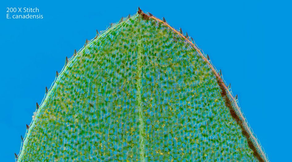 Bu görselde diferansiyel girişim kontrastı (DIC) mikroskobu ile panoramik olarak çekilen canlı bir Elodea canadensis yaprağının ucu görülmektedir. Elodea bir tatlı su bitkisidir. Görselde hücre içi organeller ve kloroplastlar rahatlıkla görülmektedir.