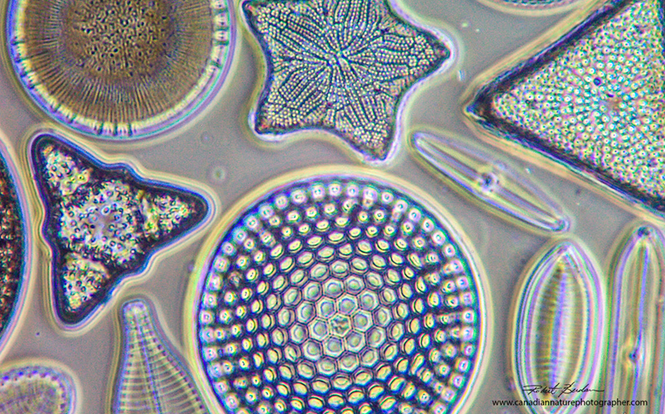 Diatomlar tek hücreli ve fotosentez yapan canlılardır. Tatlı ve tuzlu sularda yaşayabilirler. Bu canlıların kabukları ise silika (SiO₂) içerir. Mikroskop ile incelendiğinde benzersiz ve oldukça farklı desenlere sahip oldukları görülür. Benzersiz desenleri günümüzde sanatçılara ilham kaynağı olmaktadır. Yukarıdaki görselde ise diatomlar 400X büyütmede faz kontrast mikroskobu ile görüntülenmiştir.
