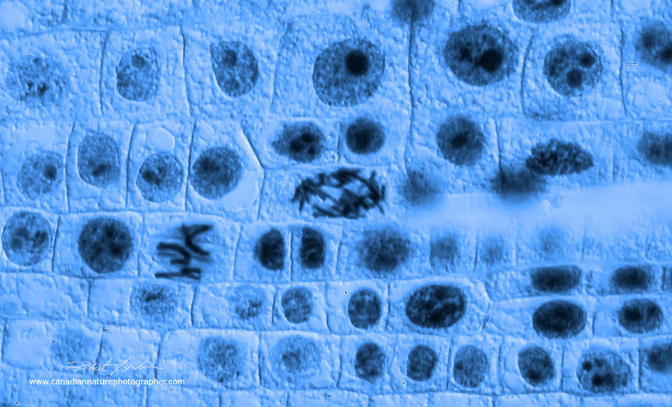 Bu görselde, 400X büyütmede parlak alan mikroskobu ile görüntülenmiş soğan kökü ucu ve hücre döngüsünün farklı evrelerinde bölünmekte olan hücreler bulunmaktadır.
