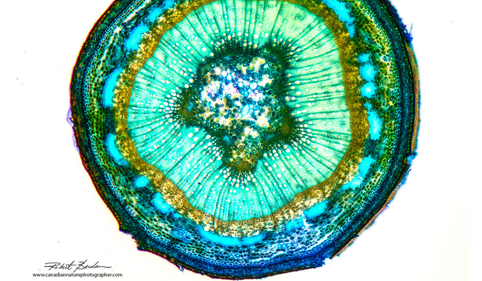 Kavak ağacı dalının enine kesiti, Toluidin mavisi ile boyanmış ve parlak alan mikroskobu ile 50X büyütmede fotoğraflanmıştır.
