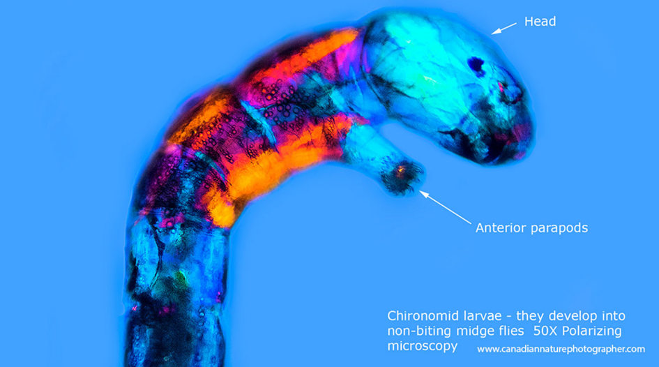Chironomidler, göletlerde yaşayan ve küçük sineklere dönüşen böcek larvalarıdır. 50X büyütmede polarizan mikroskobu ile fotoğraflanmıştır.
