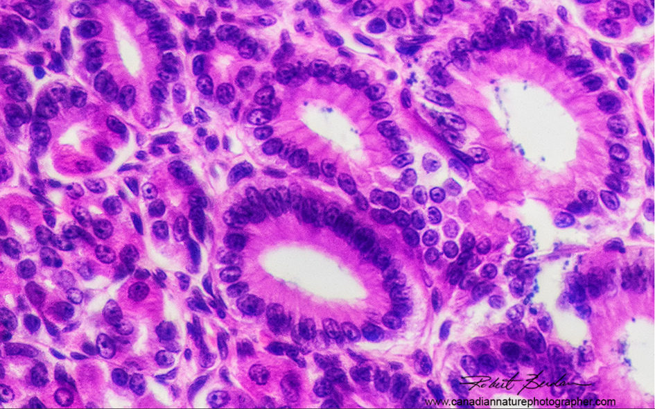 Hazır bir preparattan alınan kalın bağırsak dokusu, Hematoksilin ve Eozin (H&E) ile boyanmıştır ve parlak alan mikroskobu ile 400X büyütmede görüntülenmiştir. Çekirdekler koyu mor renkte, sitoplazma ise daha açık ve pembe tonlarındadır.