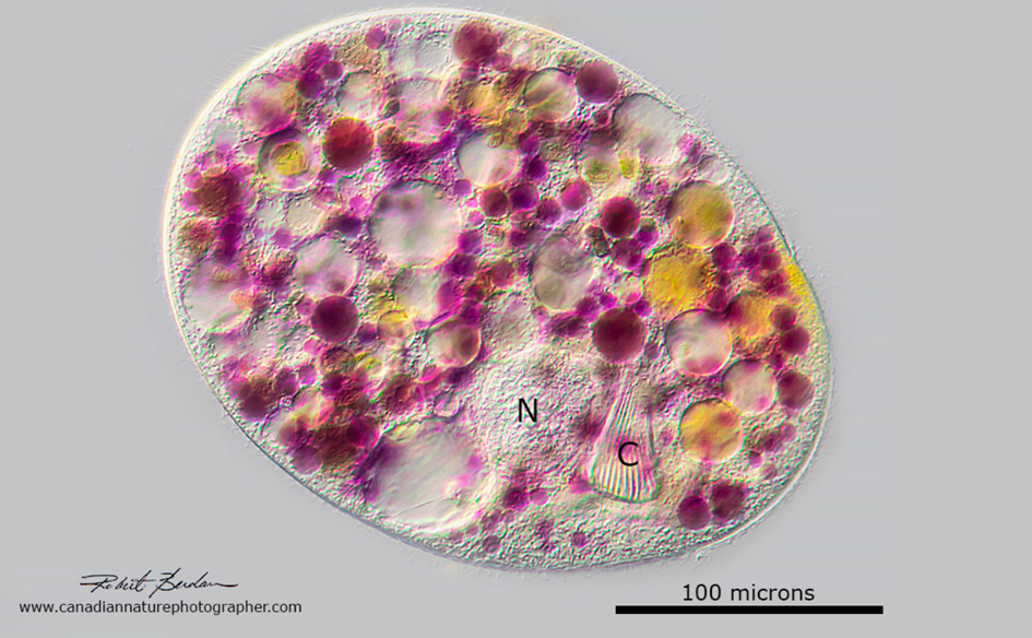 Görseldeki Nassulid silyat, 100X büyütmede diferansiyel girişim kontrastı (DIC) ışık mikroskobuyla çekilmiştir. Nassulidler, mikroskobik dünyanın Nassophorean sınıfına aittir. Bu canlılar tatlı su, hafif tuzlu sular, deniz ortamları ve nemli topraklarda yaşayabilirler.
