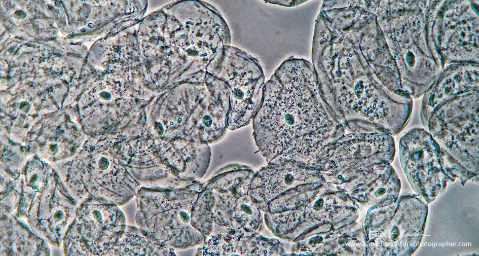 Yukarıdaki görselde pozitif faz kontrast yöntemiyle görüntülenmiş insan yanak epitel hücreleri görülmektedir. Pozitif faz kontrast, açık bir arka plan oluşturur ve yüksek kırılma indisli organeller koyu renkte görünür. Görsel 100X büyütme ile çekilmiştir. Koyu renkli noktalar, hücrelerin çekirdeğidir.