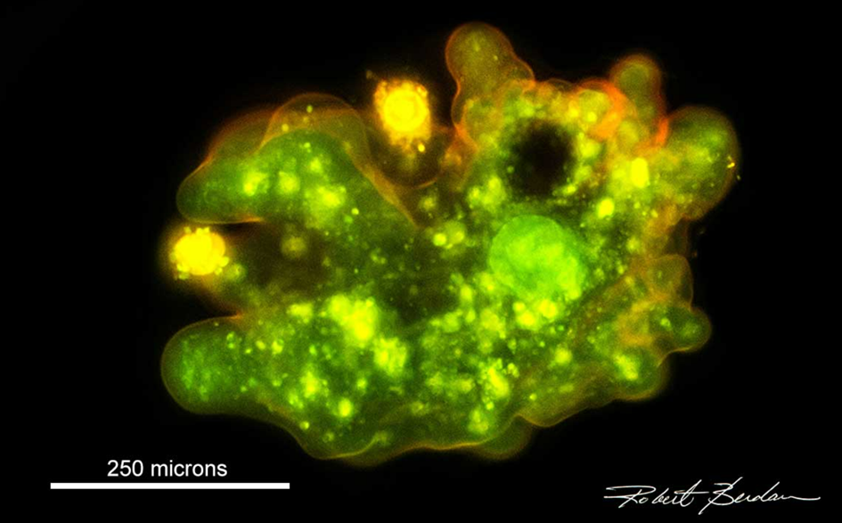 Bu görselde Amoeba proteus, akridin oranj boyası kullanılarak floresan mikroskobunda 200X büyütmede görüntülenmiştir.