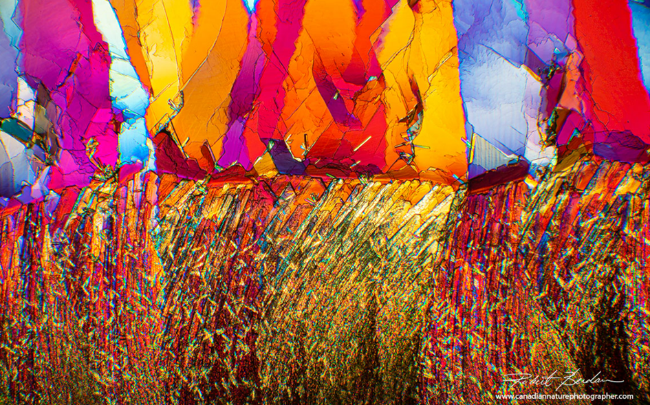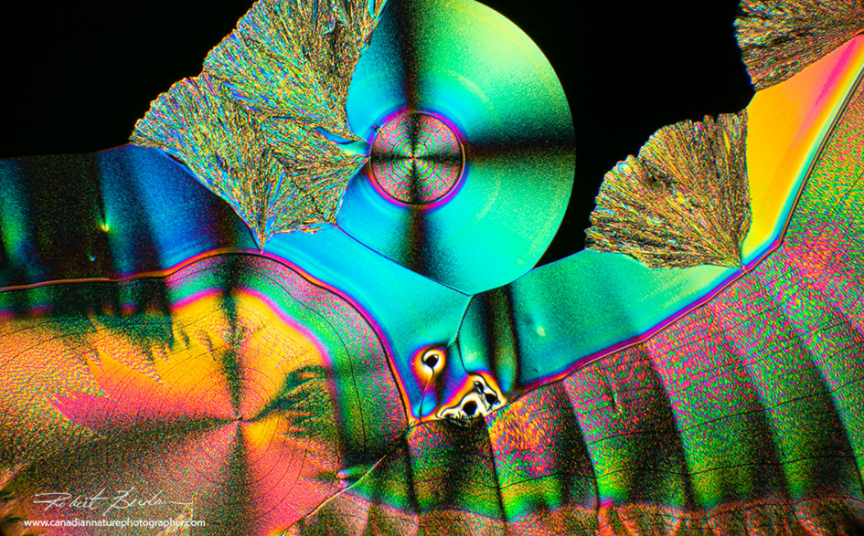 Yukarıdaki görselde C vitamini kristalleri görülmektedir. Polarize ışık mikroskobuyla gözlemlemek üzere kristal hazırlamak için ana yöntemlerden biri eritme yöntemidir ve bir sıcak tabla ya da Bunsen brülörü gerektirir.