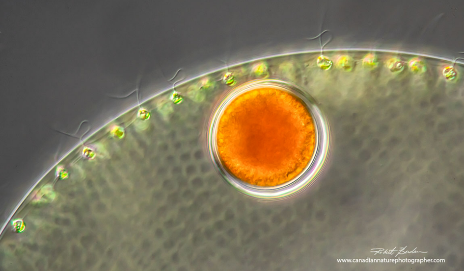 Volvox, tek hücreli canlıların oluşturduğu çok hücreli kolonilerden oluşan bir yeşil alg (chlorophyte) türüdür. Bu benzersiz yapıda sitoplazmik köprüler ile hücreler birbirine bağlıdır. Volvox, 50.000’e kadar kamçılı hücreden oluşan küresel koloniler oluşturabilir. Bu görselde Volvox’un içindeki turuncu top bir yavru kolonidir. DIC mikroskobu ile 400X büyütmede fotoğraflanmıştır.