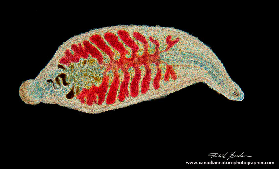 Görselde Alberta’dan tatlı su sülüğü görülmektedir. Üç çift göze sahiptir. 2,5X objektif ve karanlık alan mikroskobu (dark-field microscopy) kullanılarak fotoğraflanmıştır.