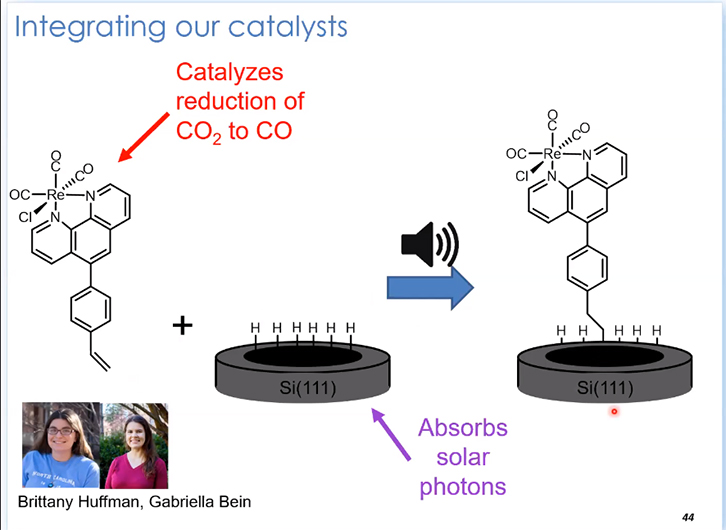 Dempsey, “Bu küçük moleküller karbondioksiti çözeltiden alacak, katalizöre yapıştıracak, elektronları pompalayacak ve karbondioksiti metanol gibi bir şeye indirgememize veya belki de nitrojeni başka bir yakıt olabilecek amonyağa indirgememize olanak tanıyan hidrojen iyonunu getirecek” dedi. Dempsey’in grubunun üzerinde çalıştığı ilk adım, halihazırda geliştirdikleri katalizörleri almak ve işlevlerine zarar vermeden bir yarı iletkene nasıl bağlayacaklarını bulmaktı ki bu basit bir süreç değildi. Dempsey’in ekibi katalizörlerinin ucuna bir karbon grubu eklemek, ardından reaktif olduğundan emin olmak için bir silikon yüzeyi aşındırmak ve yeni reaksiyonları önlemek için aşırı soğutmak zorunda kaldı. Katalizörlerini üstüne ekliyorlar ve katalizörün ucunun silikon yüzeyine bağlanmasını sağlamak için akustik kavitasyon adı verilen ve bağları aktive edebilen bir basınç değişimi yaratan bir ses cihazı olan bir sonikatör kullanıyorlar. Daha fazla yüzey bağlanmasının gerçekleşmediğinden emin olmak için farklı bir reaksiyonla takip ediyorlar. Ekip, bu karmaşık süreç boyunca moleküler katalizörün bozulmadan kaldığını doğrulayabildi.
